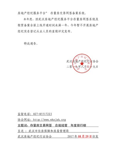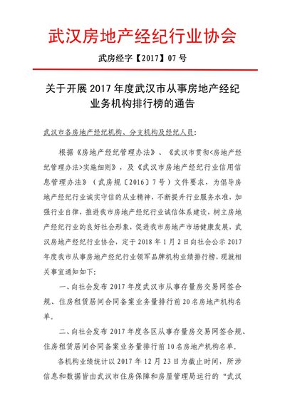 关于开展2017年度武汉市从事房地产经纪业务机构排行榜的通告