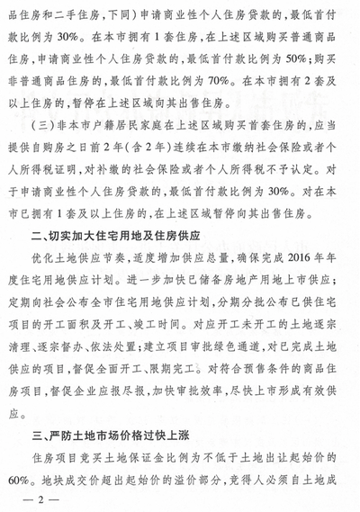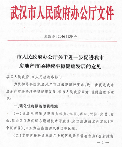 2016年11月15日凌晨,武汉市房管局官网对外公布,即11月15日起 ,外地购房者在汉购房,需提供购房之日前2年(含2年)连续在本市缴纳社会保险或者个人所得税证明;不得补缴;对拥有2套及以上住房的武汉本地购房者,暂停在住宅限购区域买房。《市人民政府办公厅关于进一步促进我市房地产市场持续平稳健康发展的意见》具体内容如下: