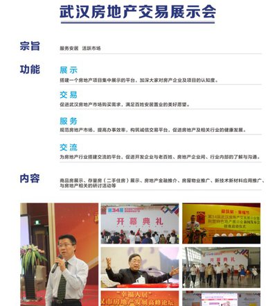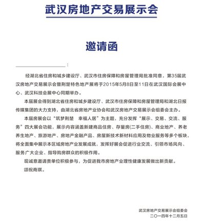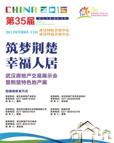 由湖北省房地产业协会和武汉房地产交易展示会组委会联合主办的、第35届武汉房地产交易展示会暨荆楚特色地产展,将于2015年5月8日至2015年5月11日,在武汉国际会展中心和武汉科技会展中心同期开展,本届展会得到了湖北省住房和城乡建设厅、武汉市住房保障和房屋管理局以及湖北日报传媒集团的大力支持,武汉房地产开发企业协会和武汉房地产中介协会倾力协办。